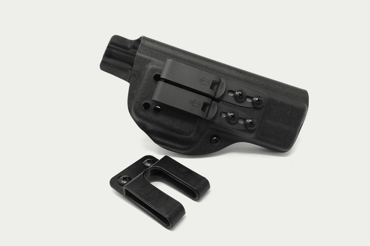 The JM Custom Kydex AIWB holster is designed to tuck the grip of the pistol into the body, yet still be comfortable to wear all day long. It comes with a retention screw so you can tighten or loosen retention as you like and it also has two sets of ride height holes in the holster body for ride height and cant adjustments. This holster has the split loop with the neoprene pad included.