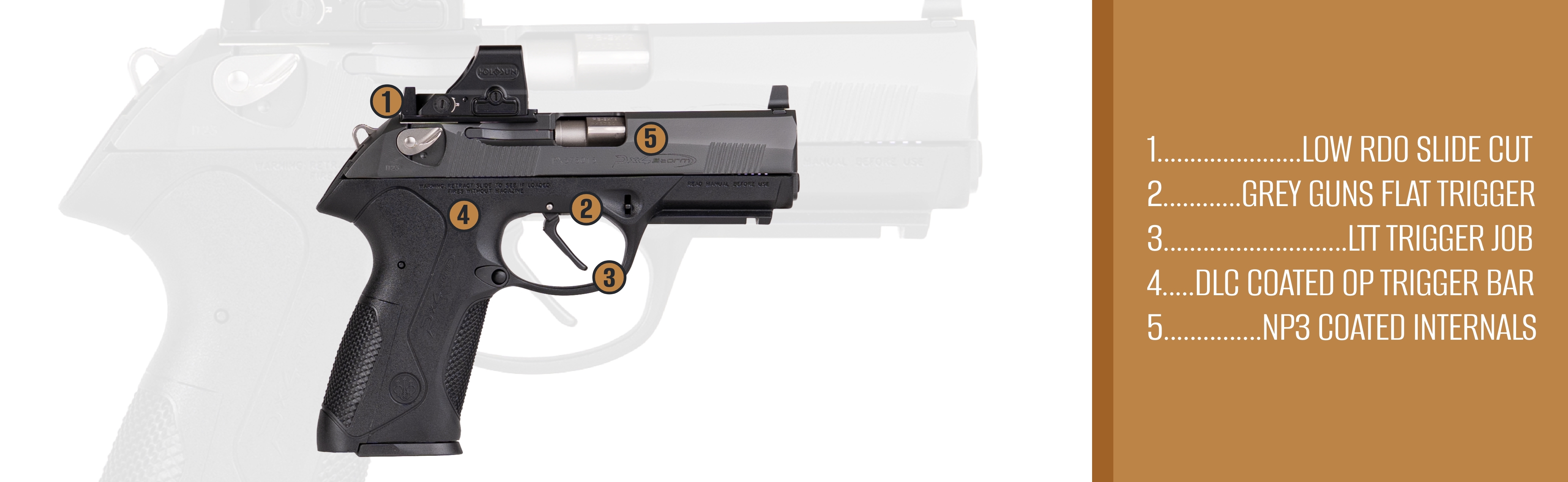 • Similar adaptor plate as the LTT 92 RDO system with an integrated back-up rear sight that is matched to the height of the replaceable front sight for proper point of impact. Please Note: RDO Slides are re-cerakoted, and this process will cover the painted red dot on the decocker lever area. NP3 Package: